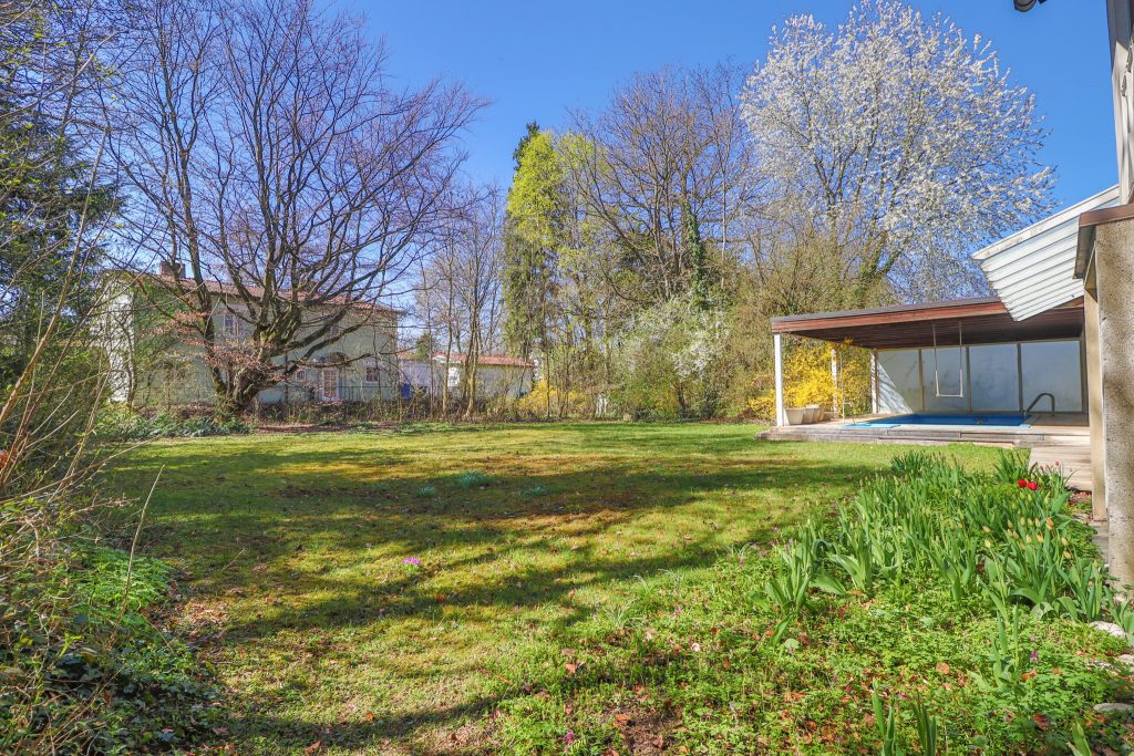 Das großzügige Haus beeindruckt bereits von außen durch seine elegante Architektur und den weitläufigen Garten, der viel Privatsphäre und Ruhe bietet. Gepflegte Grünflächen, alte Bäume und sonnige Terrassen schaffen eine einladende Atmosphäre – perfekt zum Entspannen oder für gesellige Stunden im Freien.