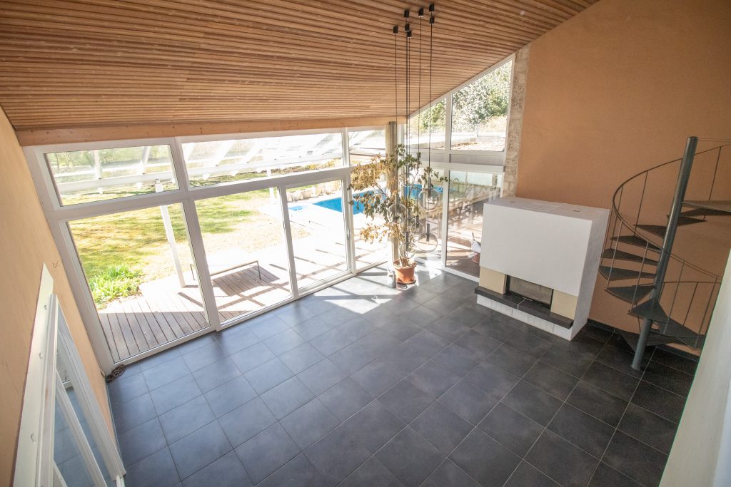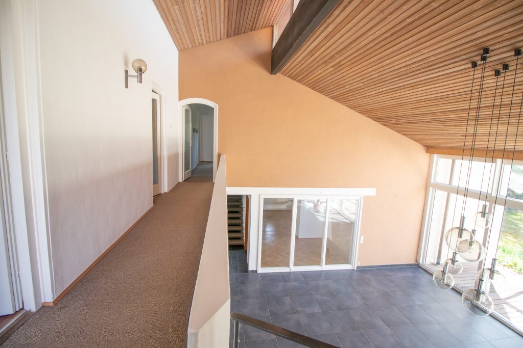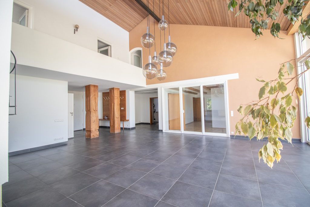 Im Inneren öffnet sich ein beeindruckendes, großes Wohnzimmer mit hohen Decken und einer offenen Galerie, die dem Raum eine besondere Weite und Leichtigkeit verleiht. Große Fensterfronten lassen viel Tageslicht herein und bieten einen schönen Blick ins Grüne. Der Kamin bildet das Herzstück des Wohnbereichs und sorgt an kühleren Tagen für eine warme, gemütliche Stimmung.