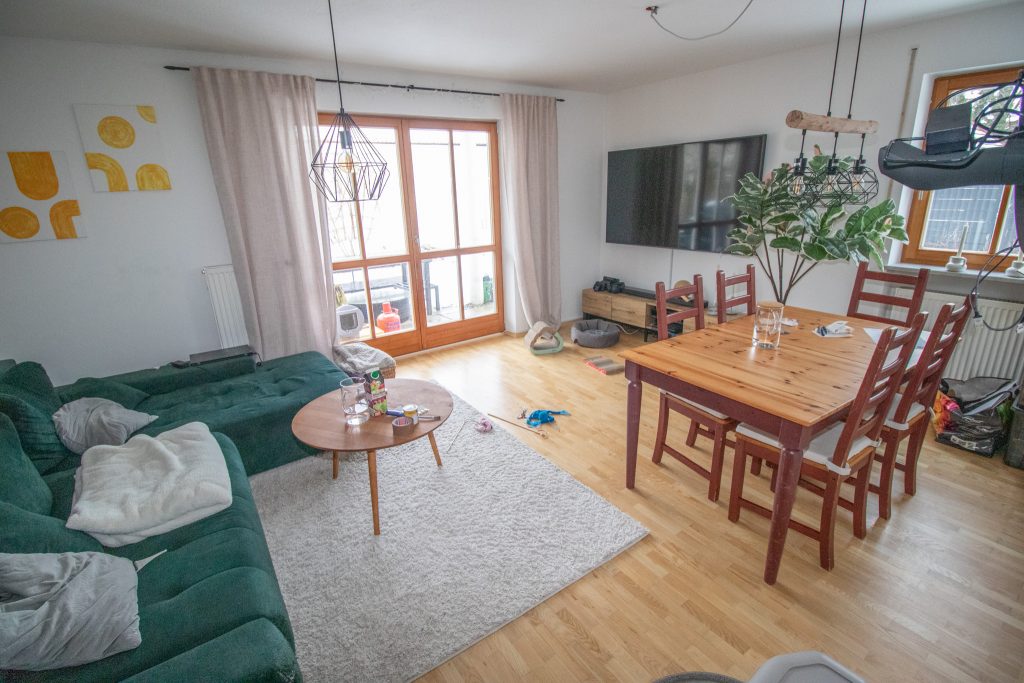 Die 3-Zimmer-Wohnung überzeugt durch eine durchdachte Raumaufteilung und einen eigenen Gartenanteil. Das helle Wohnzimmer bietet direkten Zugang zur Terrasse und in den Garten und bildet den zentralen Wohnbereich. Vom Kinderzimmer bzw. Büro aus ist eine weitere kleine, zusätzliche Terrasse erreichbar, die sich ideal als ruhiger Rückzugsort nutzen lässt.