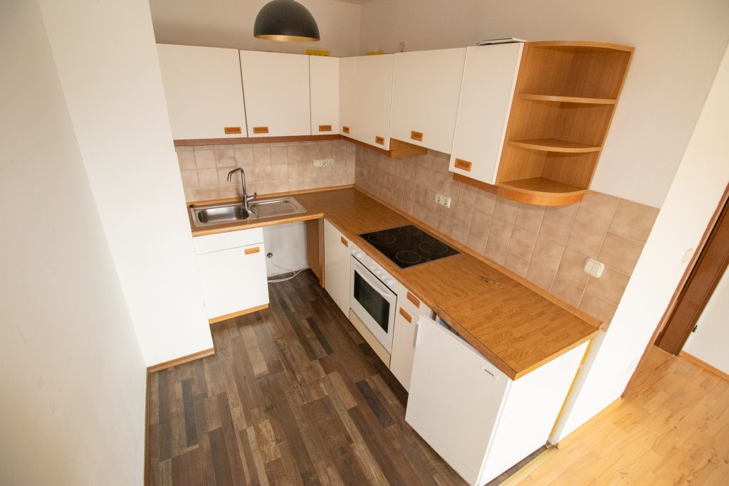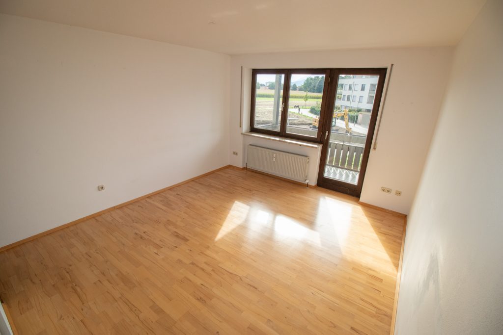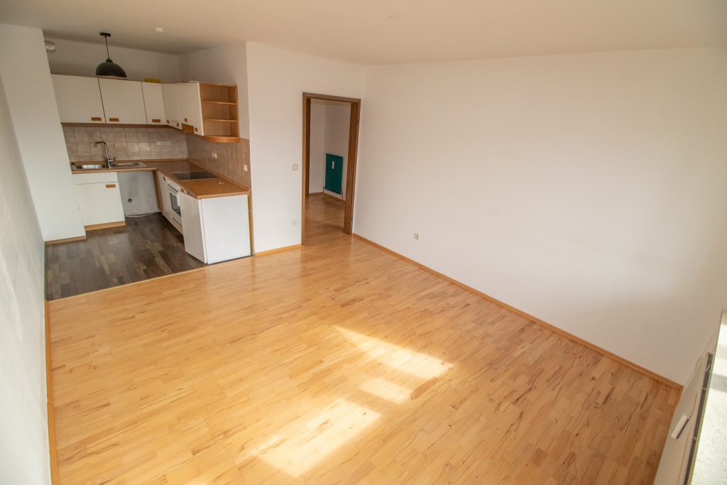 Der gemütliche Wohnbereich mit direktem Zugang zum Süd-West-Balkon bietet viel Tageslicht und lädt zum Verweilen ein. Die offene, kompakt gestaltete Küche fügt sich harmonisch in den Wohnraum ein und bietet alle wichtigen Funktionen auf kleinem Raum.